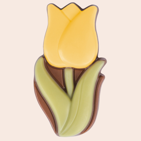 This beautiful flat chocolate figure in the shape of a tulip is made from Belgian milk chocolate and is colourfully decorated. The petals can be white, orange or yellow and the colours are chosen at random from the available stock.