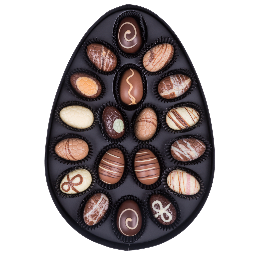 Chocolissimo élabore des cadeaux élégants et de bon goût, également pour Pâques, avec ce coffret en forme d'œuf de Pâques.
