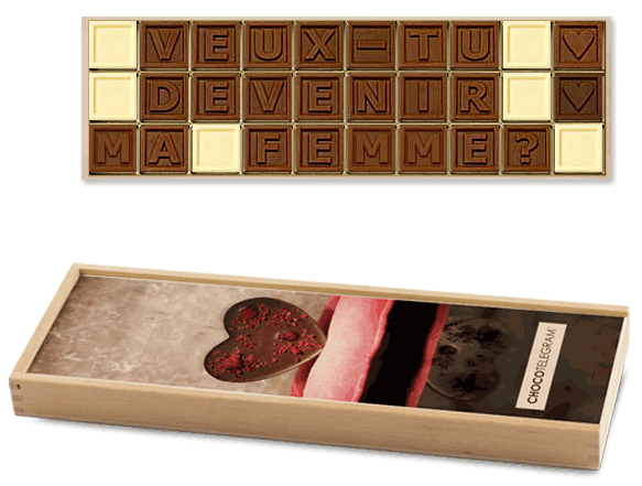Sweet chocolate wishes for the new year, Beste wensen voor het nieuwe jaar (Best wishes for the New Year), with this ChocoTelegram. Made with letters of milk chocolate and white chocolate blanks. Packed in a wooden box.