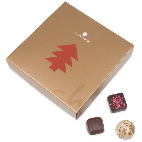 9 chocolats présentées dans une élégante boîte en carton décorée aux motifs de Noël.