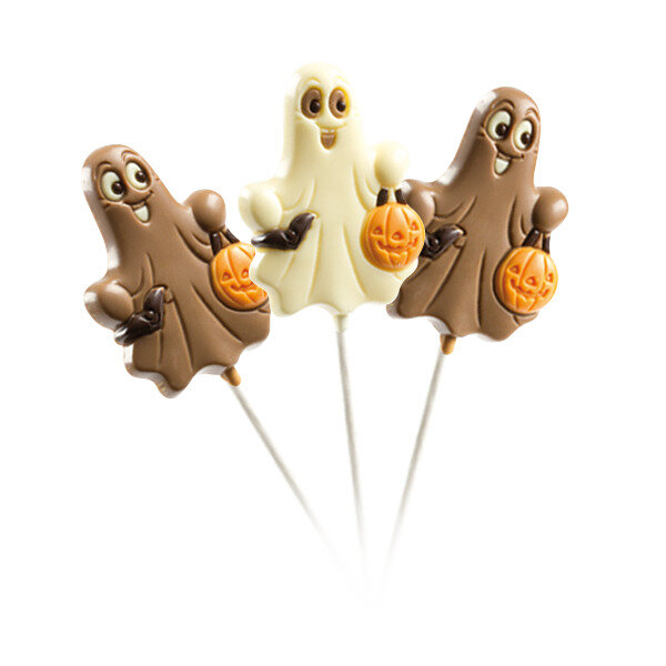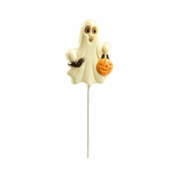 Fantome en chocolat blanc - Ingrédients: sucre, beurre de cacao, lait entier en poudre, pâte de cacao, lait écrémé en poudre, émulsifiant: lécithine de soja; arôme naturel: vanille; colorant: E160b. Teneur en cacao minimum dans le chocolat au lait 32 %, minimum dans le chocolat blanc 28 %. Peut contenir gluten, oeufs, noix, cacahuètes, sésame. Poids net: 25 g.