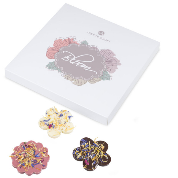 Ingrédients: sucre, beurre de cacao, pâte de cacao, lait entier en poudre, fleurs séchées: calendula, bleuet, pétales de rose, lavande, jasmin; émulsifiant: lécithine de soja; arôme naturel: vanille; lactoserum en poudre, acide: E330. Teneur en cacao minimale dans le chocolat noir 56 %, minimum dans le chocolat au lait 33 %, minimum dans le chocolat blanc 28 %, dans le chocolat rubis minimum 32%. Peut contenir gluten, oeufs, noix, cacahuètes, sésame.