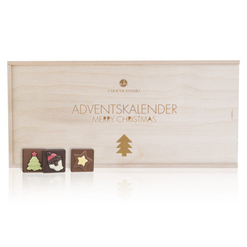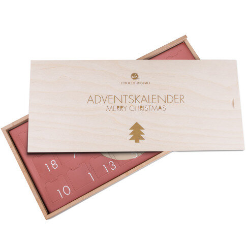 An exclusive Advent calendar in a wooden box. On the extendable lid you will find a nice decoration with Merry Christmas wishes.