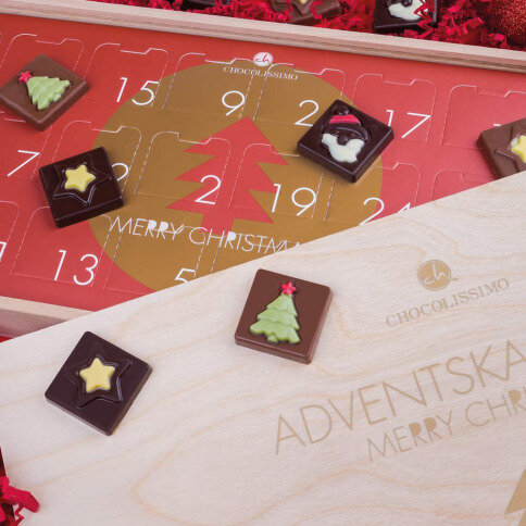 Inside you will find a red with golden Christmas decoration and 24 doors. Behind the doors are 24 chocolates hidden. These are made from Belgian milk and dark chocolate and decorated with colourful Christmas figures, namely Santa Claus, a Christmas tree and stars.