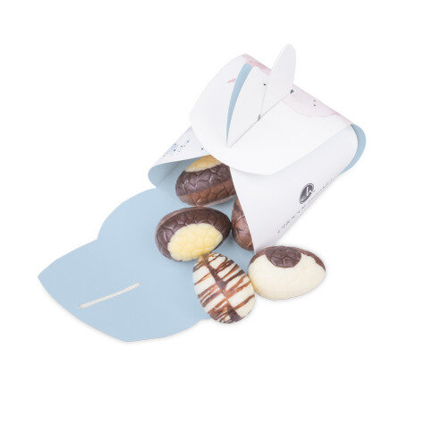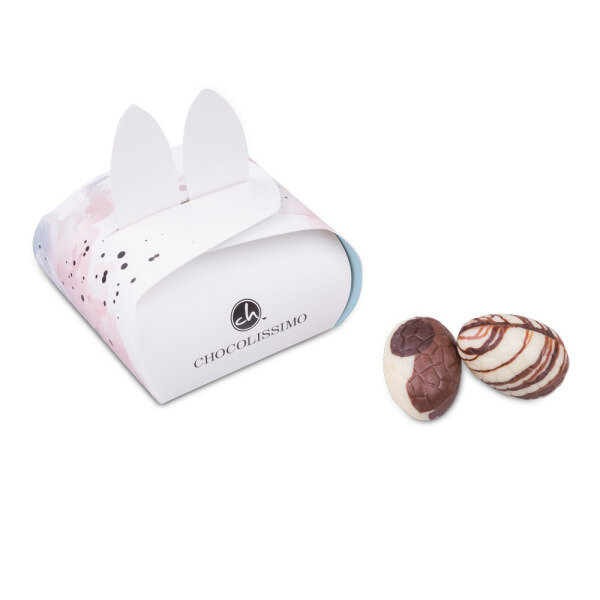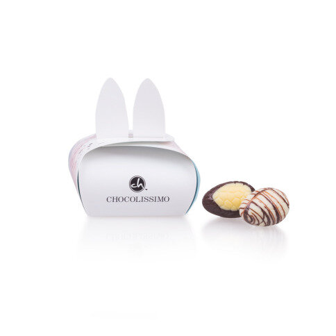 The chocolate Easter eggs are wrapped in cellophane and then placed in this beautiful but also funny box, the closure of which has ears like those of the Easter bunny. Furthermore, the box is decorated with an Easter motif.