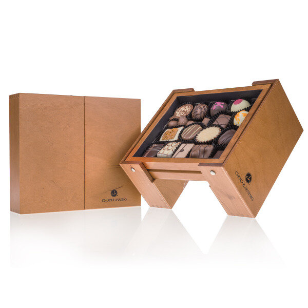 Een exclusief, magisch houten kistje van Afrikaans hout. Het, op het eerste gezicht, onopvallende kistje kan in een handomdraai omgebouwd worden tot een mooi koffietafeltje, dat gevuld is met 15 handgemaakte, zorgvuldig geselecteerde pralines, waarvan sommige met alcohol. Om u nog meer te laten genieten van deze overheerlijke pralines