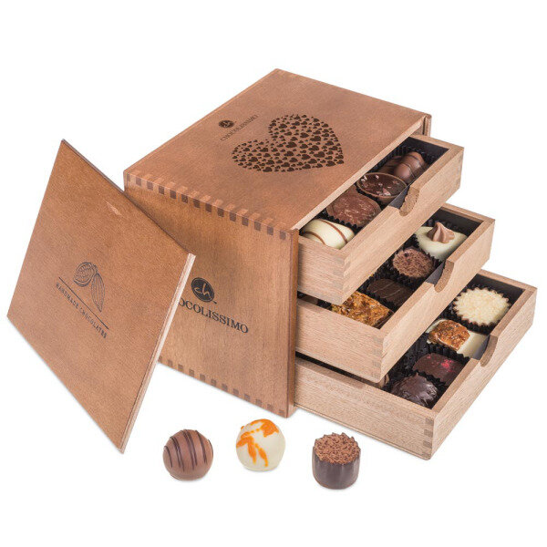 But everything starts with the gift of the exclusive lacquered wooden box made of African wood, in which the three drawers are located. On top it is decorated with a beautiful heart motif, which will certainly give the person who receives it a warm feeling. You can also have your own wishes or message engraved on the extendable lid, with a maximum of 25 characters.
