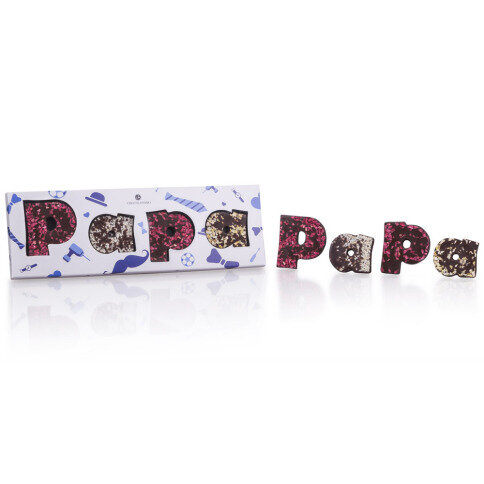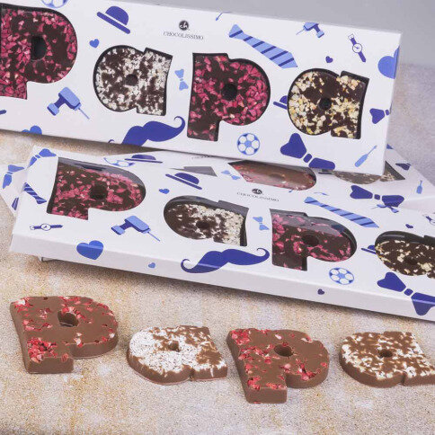 What a surprise when dad gets this box. Four fully handmade chocolate letters that together form PAPA. The chocolate letters are made of Belgian dark chocolate and lovingly decorated. The letters P with dried raspberries, the first A with dried lemon and the second A with almonds. If that's not a treat...