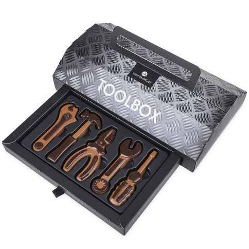 The chocolate tools are packed in a box that looks like a real toolbox. You only have to open the drawer on the front to find the chocolate.