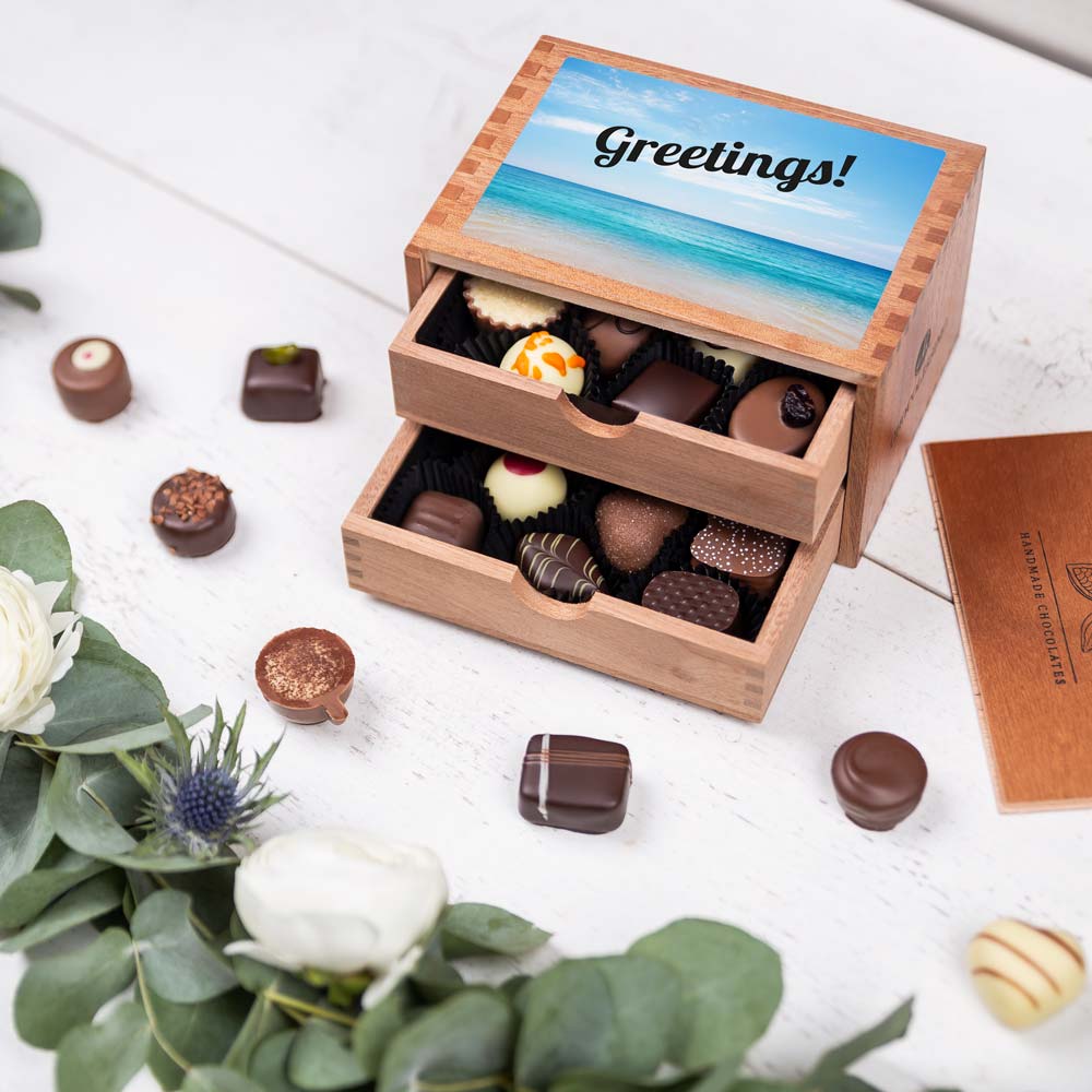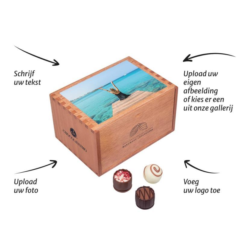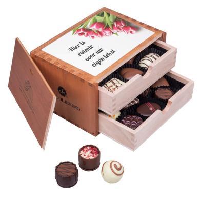 An exclusive wooden contains 20 delicious handmade pralines. The wooden box has two drawers in which are 10 chocolates each. The box is decorated with an image for dad and can be engraved with your message of maximum 25 characters.