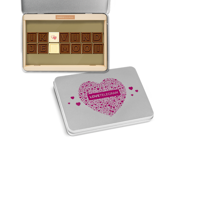 A ChocoTelegram with wishes: "Veel Geluk" (Good Luck). Packed in a metal ChocoTelegram box. A gift for many occasions.