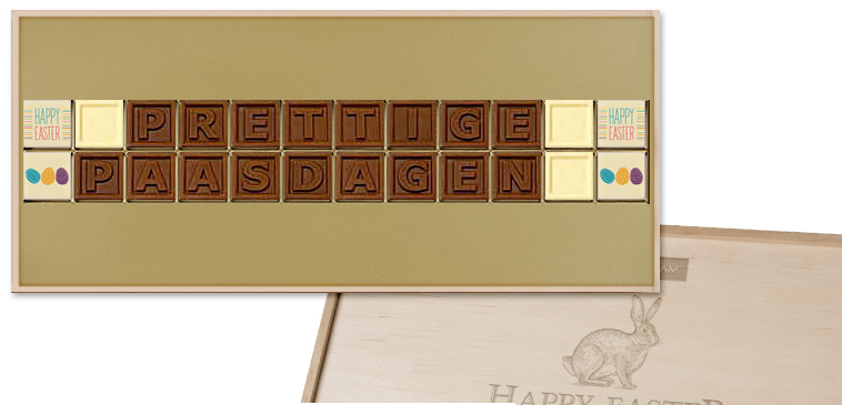 A ChocoTelegram with the message "Prettige Paasdagen" (Happy Easter). Made of milk chocolate cubes. Finished with white chocolate spaces and cubes made of milk and white chocolate with a ChocoPrint. Packed in a light wooden box for Easter.