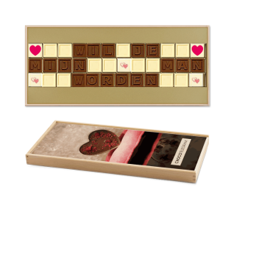 A ChocoTelegram with a proposal: "Wil je mijn man worden" (Will you be my husband). Finished with several ChocoPrints with hearts. Packed in an elegant dark wooden box.