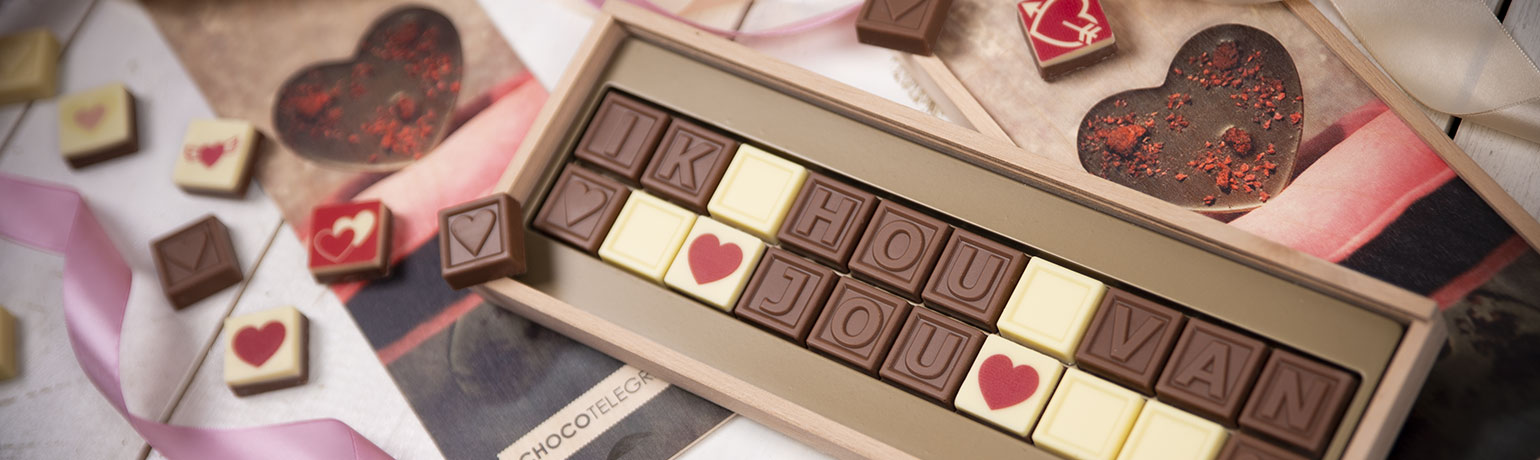 A ChocoTelegram wishes you: "Gelukkige verjaardag" (Happy Birthday). Packed in a light wooden box. Sweet birthday wishes