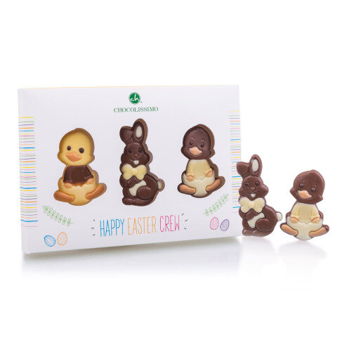 These three flat chocolate figures consist of two chicks and one Easter bunny. The chocolate figures are made with care and detail from Belgian chocolate. The Easter bunny and one of the chicks are made of delicious milk chocolate, the second chick is made of white chocolate. All have a hint of dark and white chocolate and are colourfully finished.