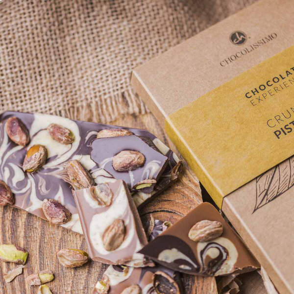 Ingredients: sugar, cocoa mass, cocoa butter, whole milk powder, hazelnuts, pistachios, whey powder, emulsifier: soy lecithin; natural flavouring: vanilla; salt. Cocoa solids in dark chocolate minimum 56%, in milk chocolate minimum 33%, in white chocolate minimum 28%. May contain gluten, eggs, peanuts, sesame .