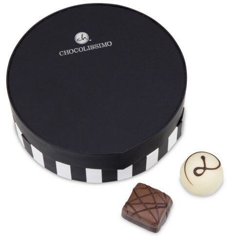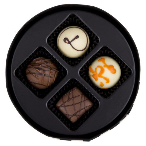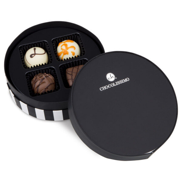 Four handmade chocolates, packed in a modern elegant round black and white box. A very nice little gift or an extra present with something different.