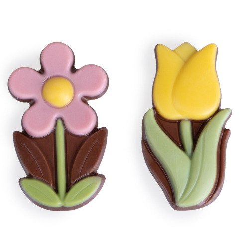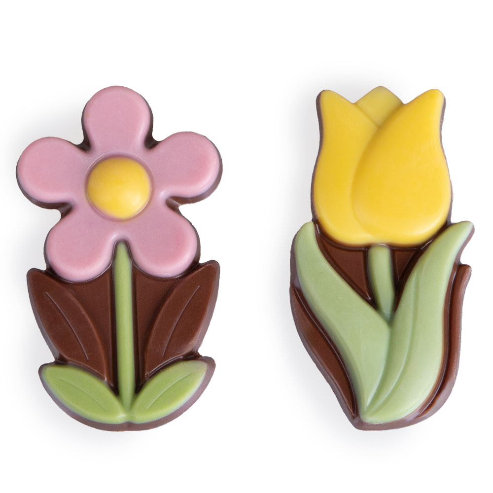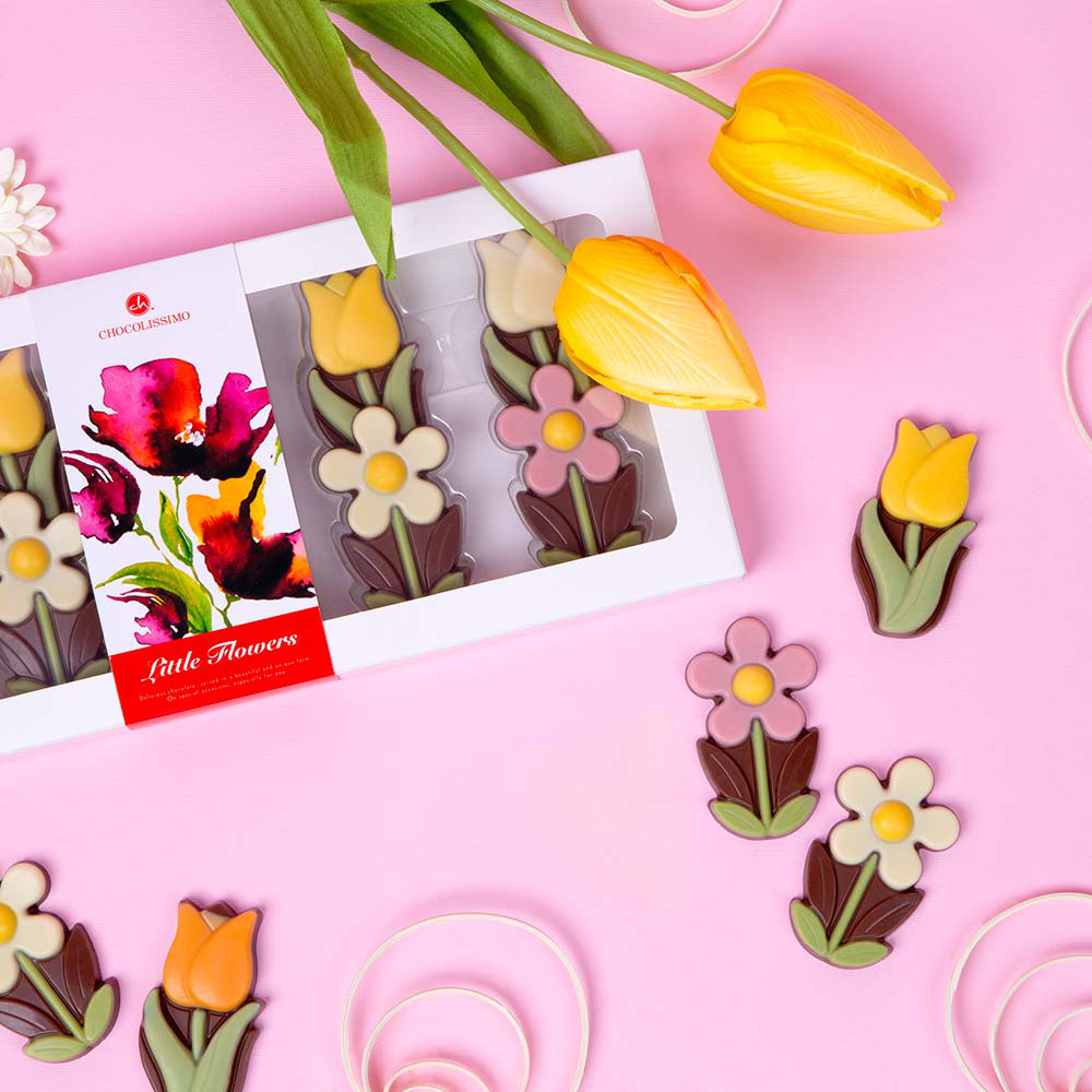 Open the box and taste the three seductive tulips and three radiant daisies. All six chocolate flowers are made from Belgian milk chocolate and colorfully decorated. The cheerful decorations make these flowers come to life.