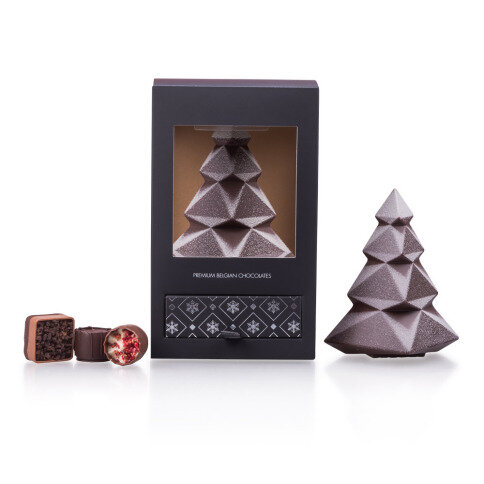 Découvrez le meilleur du chocolat belge: un sapin de Noël en chocolat noir joliment décoré, accompagné de 4 pralinés fourrés et soigneusement sélectionnés. Le tout est présenté dans une boîte très élégante avec un petit tiroir pour les pralinés.