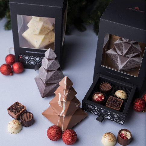 Een volledig handgemaakte chocolade kerstboom, gemaakt van pure chocolade. Daarna handmatig versierd met witte chocolade, die de sneeuw simuleerd op de boom. Verpakt in een zwart doosje met venstertjes, versierd met zilverkleurige sneeuwvlokjes.