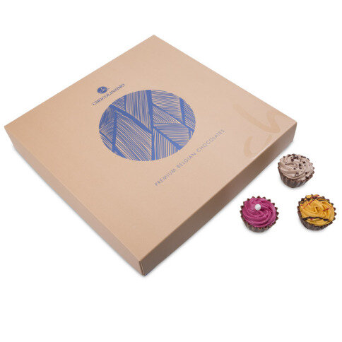 In dit stijlvolle doosje vind u 12 heerlijke pralines in de vorm van Cupcakes. In een mooi blauw doosje met een goudkleurig deksel. Een mooi en heerlijk geschenk.