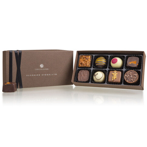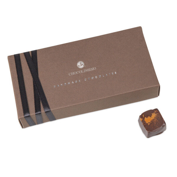 Le tout est emballé dans une élégante boîte noire fermée par un ruban Chocolissimo noir et argenté.