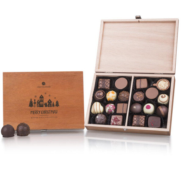 Open the wooden box and find 20 delicious pralines, made from Belgian chocolate and the best ingredients, some with, others without alcohol.