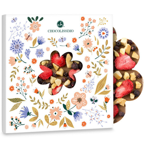 Ingredients: sugar, cocoa butter, whole milk powder, cocoa mass, dried apricots, whey powder, dried blueberries, emulsifier: soy lecithin; dried strawberries, natural flavouring: vanilla; antioxidant: E220. Cocoa solids in milk chocolate minimum 33%. May contain gluten, eggs, nuts, peanuts, sesame .