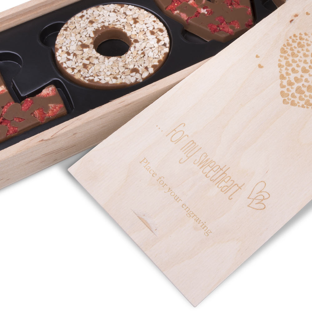 The twenty chocolates are neatly packed in the two drawers of this elegant wooden box. The box is decorated at the top with a beautiful heart motif. And if that is not enough, you can also have the box engraved with a personal message of maximum 25 characters.