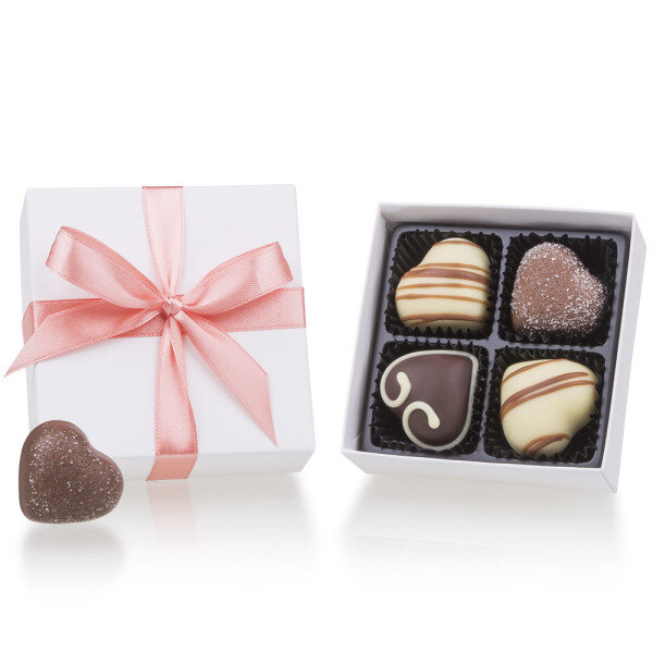 White Quadro will give you this possibility. It is a simple, but in its simplicity beautiful set with 4 heart-shaped pralines in a white box, closed with a salmon coloured ribbon.