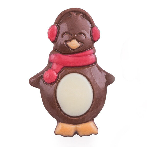 Een plat chocolade figuurtje in de vorm van een schattige pinguïn met een rode sjaal en oorverwarmers. Gemaakt van heerlijke melkchocolade, afgewerkt met witte chocolade en kleurrijk versierd.