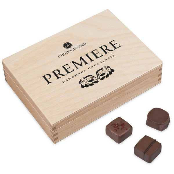 10 handmade pralines, packed in a classic, but elegant, light wooden box.