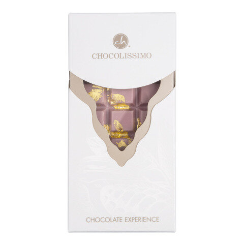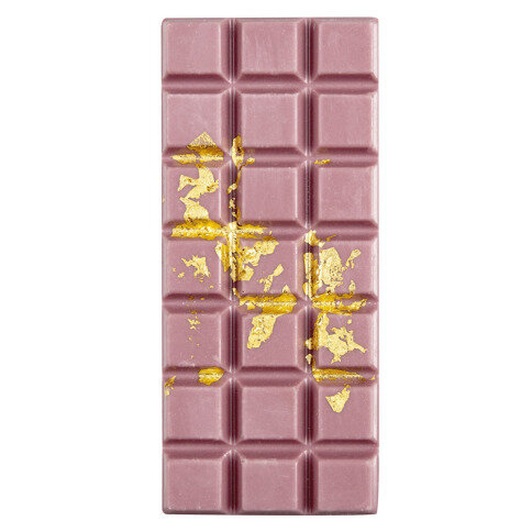Phenomenal pink chocolate - Ruby, with a unique slightly sweet and at the same time slightly sour taste, presented with unique additives, in this bar gold flakes. Packed in a stylish box with window.The perfect gift for people who are looking for new taste sensations. No colorants or fruit flavors are added.
