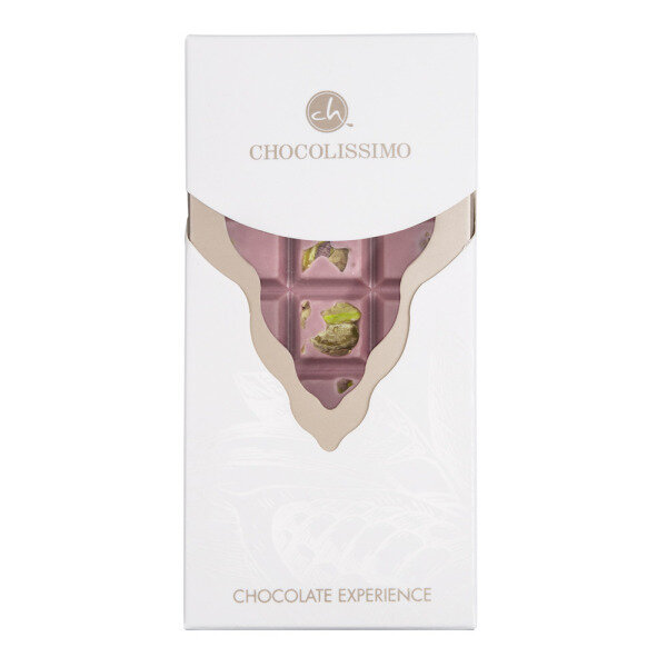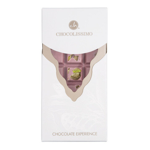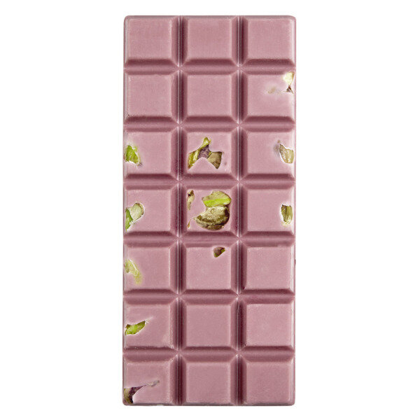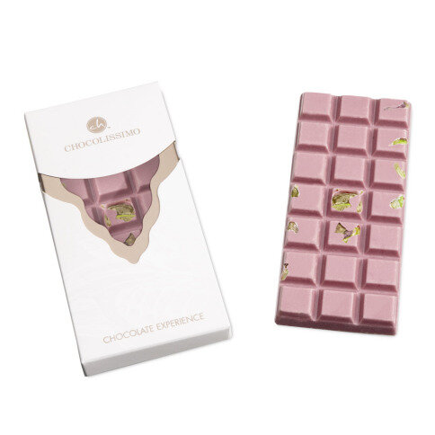 Fenomenale roze chocolade - Ruby, met een unieke lichtzoete en tegelijk lichtzure smaak, gepresenteerd met unieke toevoegingen, in deze reep pistachenoten. Verpakt in een stijlvol doosje met venster. Het perfecte geschenk voor mensen die op zoek zijn naar nieuwe smaaksensaties. Geen kleurstoffen of fruitaroma's worden toegevoegd.