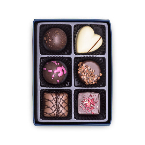 A Super Dad box filled with six handmade pralines. Delicious and funny. Perfect to give on Fathers Day, but also to surprise your dad throughout the year.