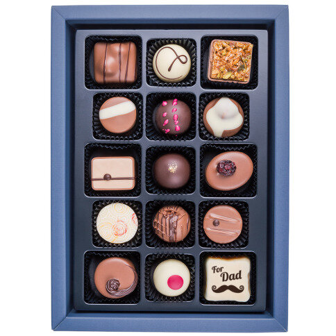 All chocolate figures are packed together in a nice box with silver coloured lid that hold a visible postcard. This postcard you can choose yourself, either from our offer or by uploading your own photo. You write a short text or wishes and we will print the postcard and stick it in the lid.
