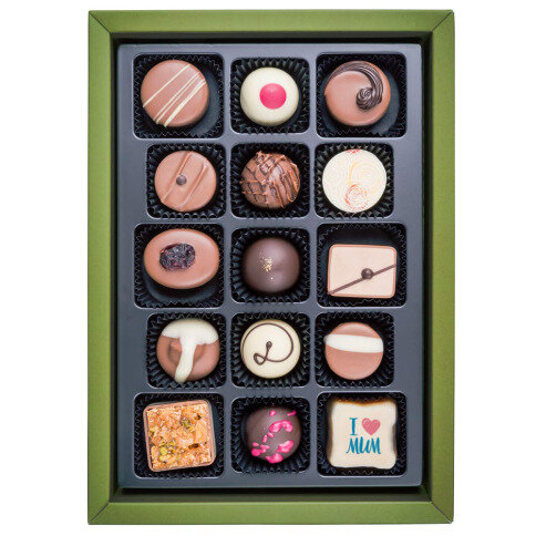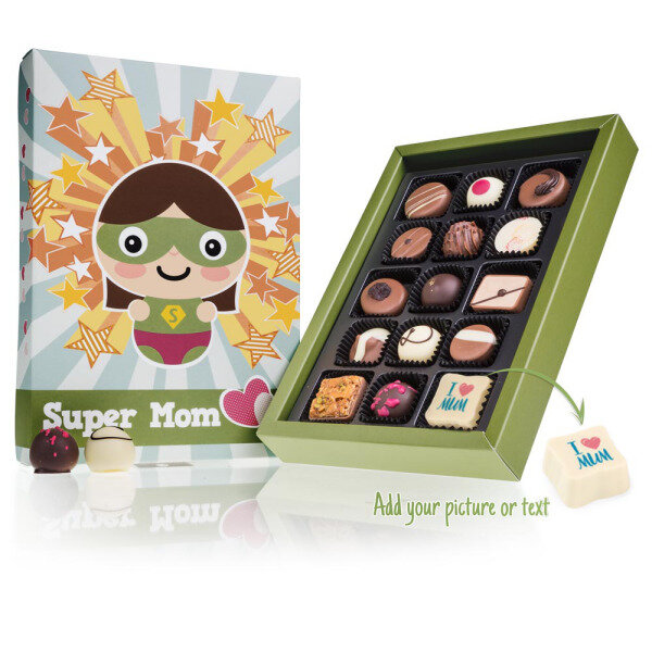 The chocolates are lovingly packaged in a nice green box with a Super Mom image on the lid. The message couldn't be clearer.