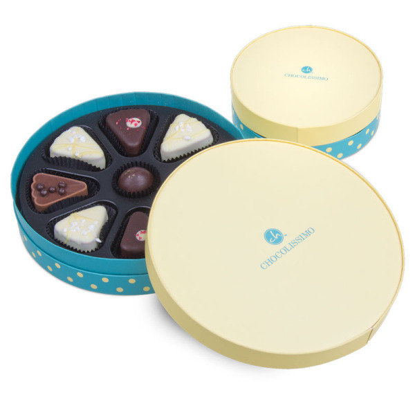 In total 14 delicious pralines, made from Belgian chocolate and quality ingredients. In the big box you will find 8 pralines in the shape of pie wedges, with in the middle a round praline. In the small box you will find 5 pralines in the shape of slices of cake.