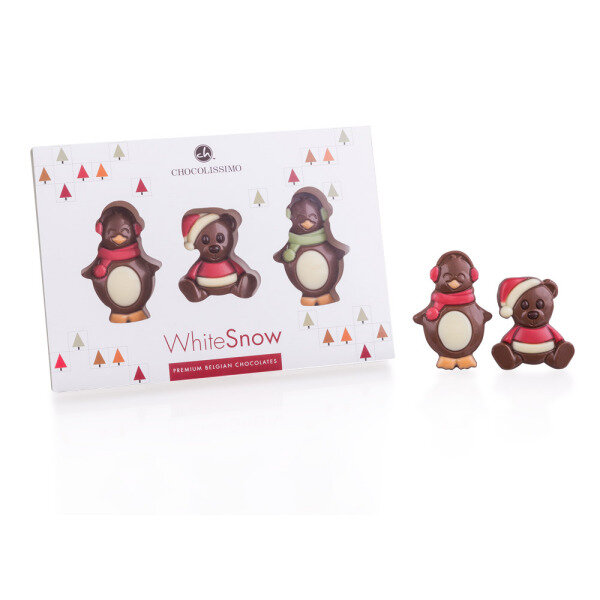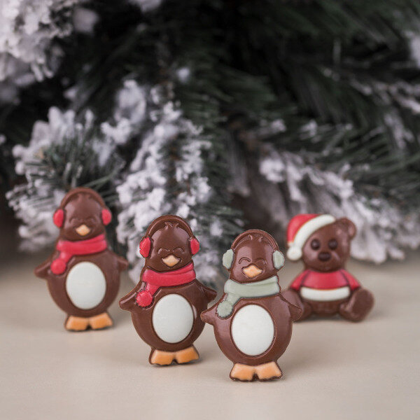 Three cute, flat chocolate figures, all made of the best milk chocolate, finished with dark and white chocolate and colourfully decorated. U will find a teddy bear, cute, with a Christmas hat and two funny penguins with a scarf and ear warmers.