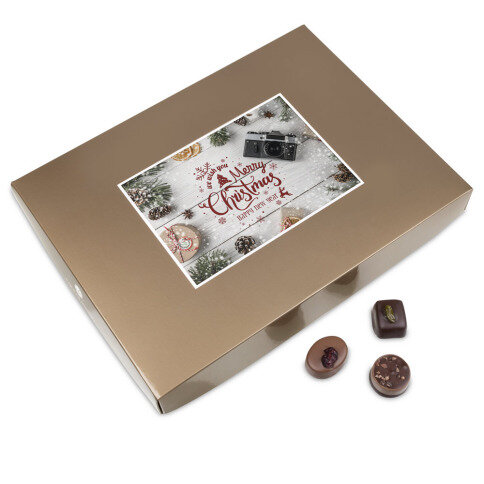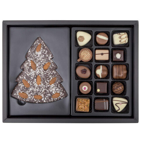 In the box you will find 15 delicious pralines, all made from de best Belgian chocolate and quality ingredients. Next to it there is also a chocolate bar in the shape of a Christmas tree, made from dark chocolate. The chocolate Christmas tree is decorated with almonds and coconut flakes.