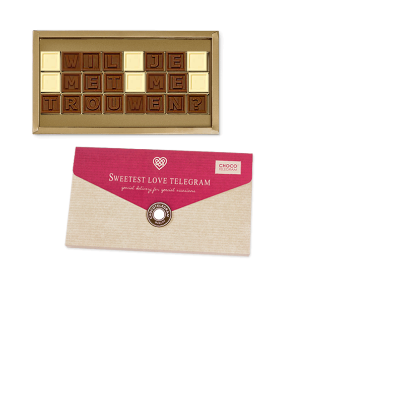 Idée originale pour cette question unique Wil je met me trouwen? (Veux-tu m'épouser?). Fait de chocolat belge de la meilleure qualité et emballé dans une boite avec de coeur.
