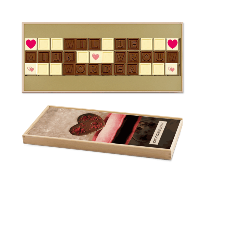 ChocoTelegram avec le message: "Wil je mijn vrouw worden" (Veux-tu devenir ma femme). Présenté dans une boîte en bois.