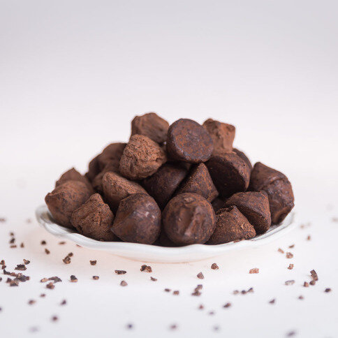 Trente délicieux chocolats faits main, présentés dans une boîte rectangulaire personnalisable.