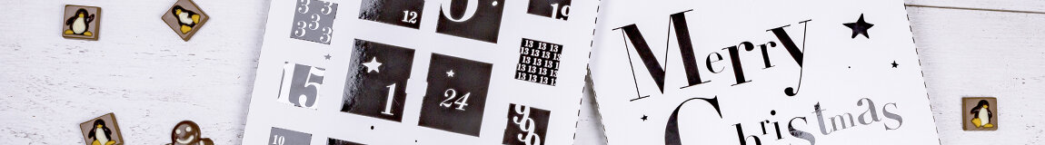 The Advent calendar has a white with black design with subtle Christmas motif.