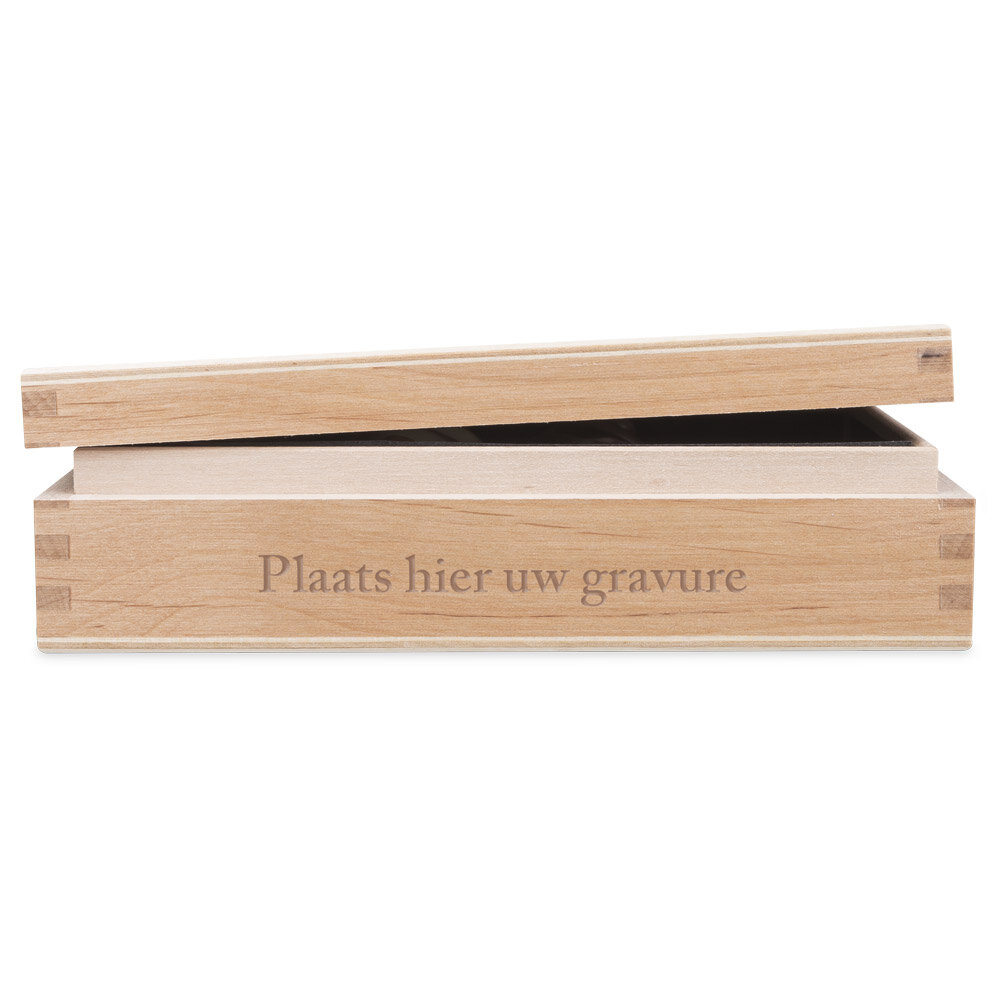 Voorzichtig worden ze in het kistje geplaatst dat gemaakt is van licht hout. U hebt tevens de mogelijkheid om op de zijkant een gravure te laten aanbrengen, met een maximum van 25 tekens, die een persoonlijke boodschap of wensen kan bevatten.