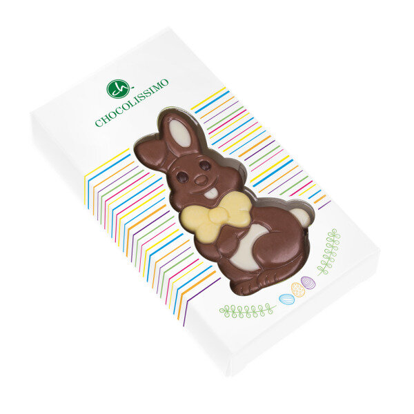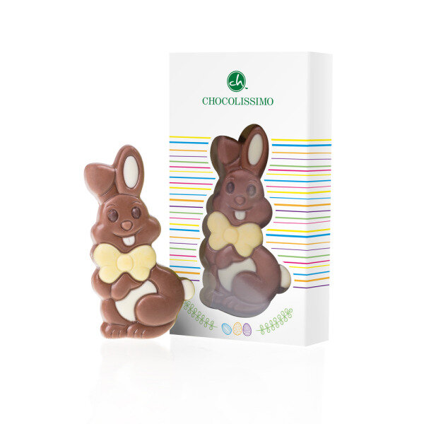 Het chocolade figuurtje wordt veilig verpakt in een leuk doosje met venster en kleurrijk paasmotief.
