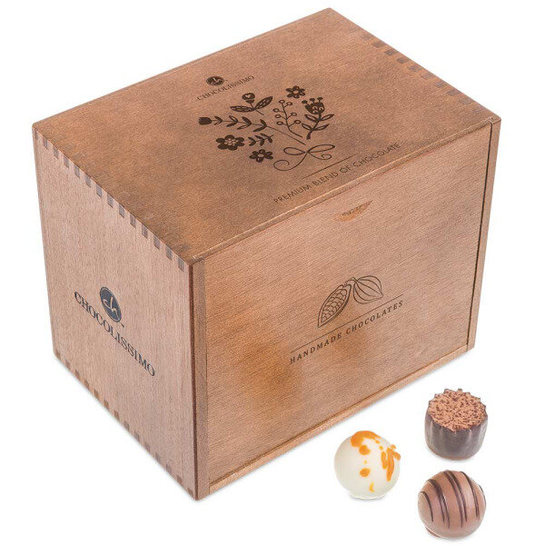 Exclusief stijlvol houten kistje, voorzien van drie schuifjes en een bloemenmotief. Het kistje bevat 30 handgemaakte, zorgvuldig geselecteerde, pralines, waaronder sommige met alcohol. Alle pralines zijn gemaakt van de beste chocolade en met kwaliteitsvolle ingrediënten. Een ideaal geschenk om zowel anderen als uzelf te verwennen.