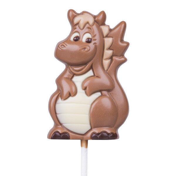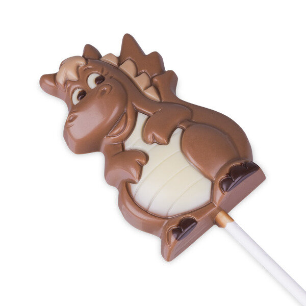 Een chocolade lolly in de vorm van een grappig draakje. Gemaakt van melkchocolade, versierd met pure en witte chocolade.