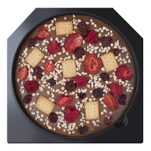NL Ingrediënten: suiker, cacaoboter, volle melkpoeder, gedopte gehakte amandelen, cacaomassa, gedroogde aardbeien, weipoeder, veenbes, gedroogde frambozen, emulgator: soja lecithine; tarwemeel, natuurlijk aroma: vanille; plantaardige olie: zonnebloem, palm; glucose-fructosestroop, boter, rijsmiddel: E500ii, E450; zout, magere melkpoeder, aroma's, zuurteregelaar: E330; eipoeder, tarwezetmeel. Cacaomassa in melkchocolade minimum 33 %. Bevat naast cacaoboter ook plantaardige vetten. Kan pinda's, sesam bevatten.