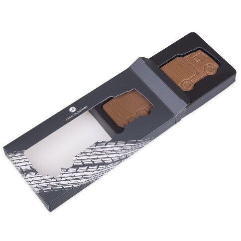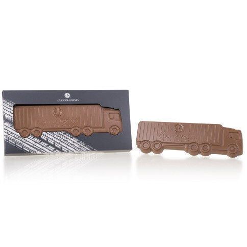 A delicious chocolate bar in the shape of a truck with trailer. The chocolate truck is made of Belgian milk chocolate. The chocolate bar is packed in box with window and a relevant motif. A delicious gift for all the fans or professionals.